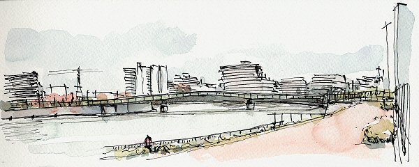 新豊橋に次いで二番目に新しい平成18年(2006)に開通した橋で周りの集合住宅群と一体に計画された橋なのだろう、軽快な形とカラーリングが素晴らしい。それにまして、この辺りから川辺に葦が意識的に植えられている。水の浄化の一助にするためだろうが、景観がどんなにスケールアウトしていても馴染みやすいものにしてくれる。植物は景色の七難を隠すとはよく言われることだけれど・・・・