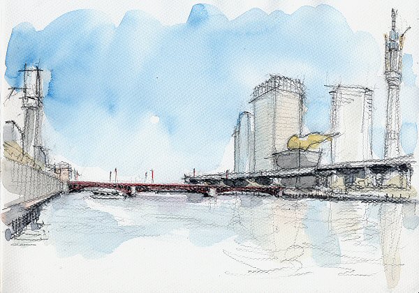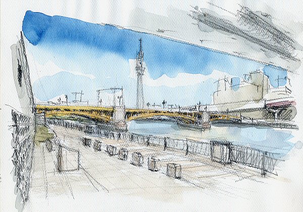 この浅草の賑わいは現在の「スカイツリー」人気に拍車が掛かり、橋の上はカメラを手にした人で大混乱。スケッチは遠慮して遠景となった。