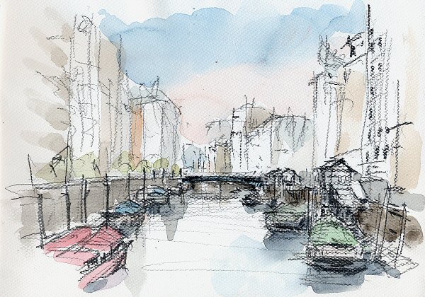 荒川堤から川上を見た旧水門と荒川上流 左後に続く新水門から隅田川へと連なっていく 2009.11.28 鉛筆・透明水彩